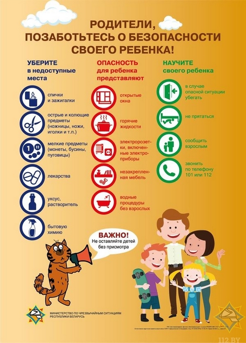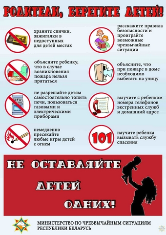 Уважаемые родители, никогда не оставляйте детей одних! На несколько минут оставшиеся без присмотра малыши для спасателей – чрезвычайная ситуация. Этих «пяти минут» достаточно, чтобы бросить зажженную спичку, попробовать «непонятную» жидкость на вкус, взобраться на окно, поиграть с радиатором, не говоря уже о том, чтобы проглотить таблетку или батарейку. Вы всегда должны быть рядом с ними на расстоянии вытянутой руки. Обучайте безопасности детей, рассказывайте об опасных местах для игр и будьте для детей примером!