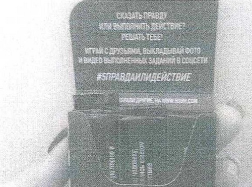 Жевательная резинка в черной упаковке предлагает потребителям сыграть в игру «Правда или действие» - ответить на вопрос либо совершить какое-то действие. Ответ или фотоотчето выполненном задании предлагается выкладывать в сеть. Среди заданий действительно есть такие, которые могут навести подростка на мысли о смерти - те же самые предложения залезть на самую высокую точку в городе, составить список предсмертных дел или ходить весь день в черной одежде. Выполняя некоторые задания, ребенок или подросток может оказаться в опасности. Например, жвачка предлагает улыбаться незнакомцу, попросить таксиста отвезти к себе домой, выложить в сеть фото своего самого странного поступка. Вряд ли производители рассчитывали, что задания бросятся выполнять взрослые потребители, а вот многие подростки включатся в игру с удовольствием.