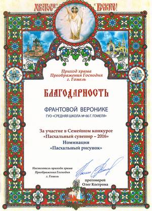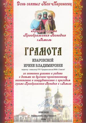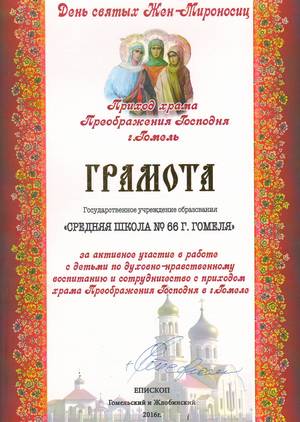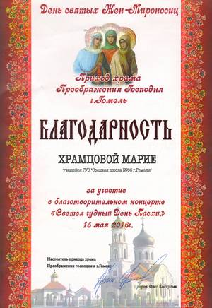 05.05.2016 состоялся концерт, посвященный православному празднику Жен-мироносиц, во время которого состоялось награждение нашей школы за активное участие по духовно-нравственному воспитанию учащихся в сотрудничестве с храмом Преображения Господня. Также грамотой была награждена педагог-психолог Иваровская И.В., вручены дипломы 3 степени в номинации « Пасхальный сувенир» педагогу социальному Воронцовой И.М., учащимся 8 Б класса Алексейчук А., Рачкову В.