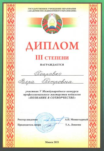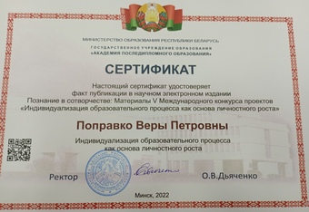 ПОЗДРАВЛЯЕМ ПОПРАВКО ВЕРУ ПЕТРОВНУ, учителя истории и обществоведения, с победой в Международном конкурсе проектов «Индивидуализация образовательного процесса как основа личностного роста» (15.12.2021 — 17.12.2021)