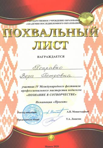 21-23.10.2020 в УО «Академия последипломного образования» г. Минск состоялся IV Международный фестиваль профессионального мастерства «Познание в сотворчестве». В рамках фестиваля прошел конкурс индивидуальных образовательных программ интеллектуально одаренных учащихся и их тьютерское сопровождение.