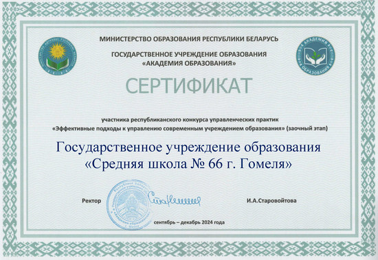 В соответствии с приказом отдела образования спорта и туризма администрации Центрального района г.Гомеля "О проведении экспериментальной и инновационной деятельности в учреждениях образования Центрального района г.Гомеля в 2024/2025 учебном году" от от 30.08.2024 № 380 в государственном учреждении образования "Средняя школа № 66 г. Гомеля" осуществляется инновационный проект «Внедрение модели формирования функциональной грамотности как основы социализации и профессионального самоопределения учащихся посредством индивидуализации образовательного процесса»