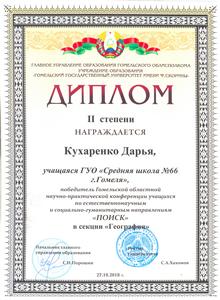 Учащаяся 10 "А" класса нашей школы, Кухаренко Дарья, стала победителем Гомельской областной научно-практической конференции учащихся по естественнонаучным и социально-гуманитарным направлениям "ПОИСК" в секции "География" и награждена дипломом II степени.