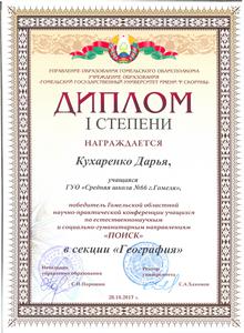 Учащаяся 9 "Д" класса Кухаренко Дарья награждена дипломом I степени за победу в Гомельской областной научно-практической конференции учащихся по естественнонаучным и социально-гуманитарным направлениям "ПОИСК" в секции "География".
