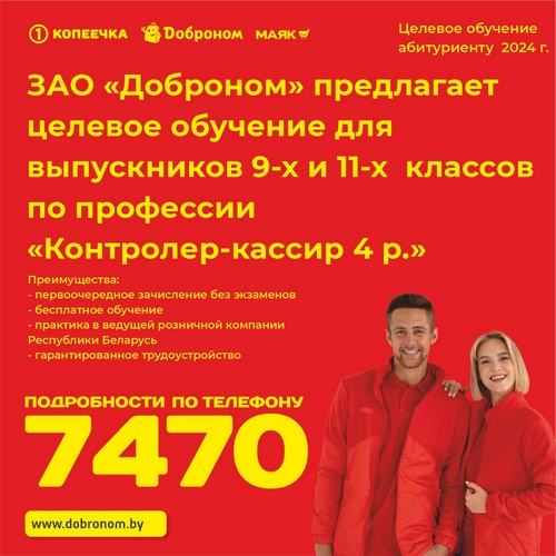 В соответствии с Положением о целевой подготовке специалистов, рабочих, служащих, утвержденным постановлением Совета Министров Республики Беларусь от 31.08.2022 №572, сообщаем о возможности получения среднего специального образования в учреждении образования «Минский государственный финансово-экономический колледж» на условиях целевой подготовки по специальности «Банковская деятельность» квалификации «Специалист по банковским услугам» с последующим трудоустройством в Региональной дирекции по Гомельской области ОАО «Белагропромбанк». После трудоустройства ОАО «Белагропромбанк» предоставляет также возможность получения высшего образования на заочной форме обучения с оплатой за счет средств ОАО «Белагропромбанк» до 100%.