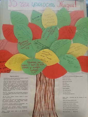 В рамках мероприятий по профилактике суицидального поведения в школе прошла акция "В чем ценность жизни". Учащиеся 6 - 11 классов выразили свое мнение и разместили на "Древе Жизни". Самыми главными ценностями назвали здоровье, семью, друзей, познание себя и мира, любовь и саму жизнь. Также ученики 4 - 5 классов приняли участие в конкурсе рисунков "Как прекрасен этот мир!", выражая позитивное настроение и оптимистичный взгляд на мир.