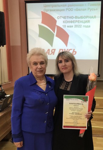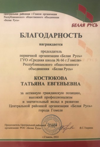 10.05.2022 года состоялось отчетно-выборная конференция ЦРО «Белая Русь» г. Гомеля, на которой выступали с отчетами о своей работе первичные организации «Белая Русь» Центрального района, в том числе и первичная организация нашей школы. За высокий профессионализм, активную гражданскую позицию, значительный вклад в развитие ЦРО «Белая Русь» г. Гомеля награждены директор ГУО "Средняя школа №66 г.Гомеля" А. А. Котило и председатель первичной организации школы Костюкова Т. Е.