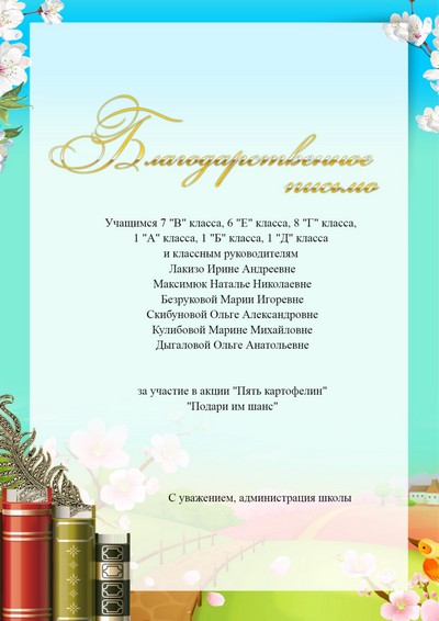 Члены волонтерского отряда «Огонек» выражают огромную благодарность классным коллективам и их классным руководителям, которые приняли активное участие в благотворительных акциях «Забота», «Пять картофелин», «Подари им шанс». Этим классам были вручены грамоты за активное участие от руководителя отряда Костюковой Т.Е.
