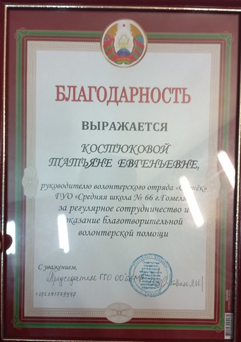 20.12.2016 в Центральной городской библиотеке им. Герцена состоялось чествование волонтерских отрядов Центрального района г.Гомеля. Волонтерский отряд «Огонёк» ГУО «Средняя школа № 66 г.Гомеля» был удостоен диплома за развитие волонтерского движения в Центральном районе г.Гомеля. Также за активное участие в волонтерском движении Центрального района благодарственные письма получили учащиеся СШ №66 Круподёрова Владислава и Касперович Анастасия. Победителем в номинации «Личный вклад», а также «Волонтер года – Доброе сердце» стал учащейся СШ № 66 Скрыпников Александр, получивший награду от ЦРО БРСМ.