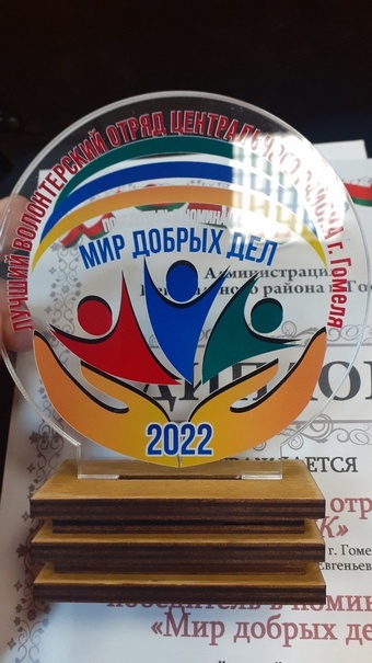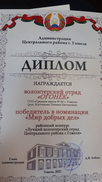 05.01.2023 в Администрации Центрального района г.Гомеля прошло торжественное чествование волонтерских отрядов Центрального района, на котором присутствовали волонтерские отряды учреждений среднего, специального и высшего образования, предприятий и организаций Центрального района. Волонтерский отряд «Огонек» был удостоен диплома победителя в номинации «Мир добрых дел» в районном конкурсе «Лучший волонтерский отряд Центрального района г.Гомеля»