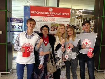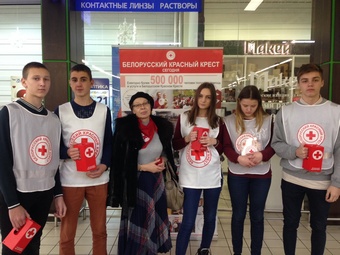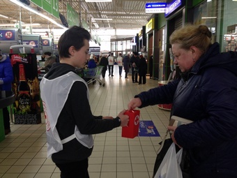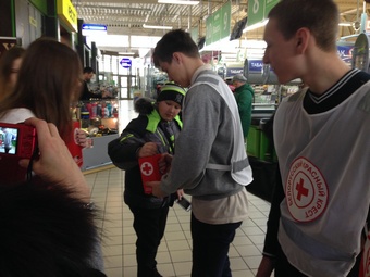 Волонтеры приглашали покупателей внести пожертвование в копилку Красного Креста, а также раздавали листовки.