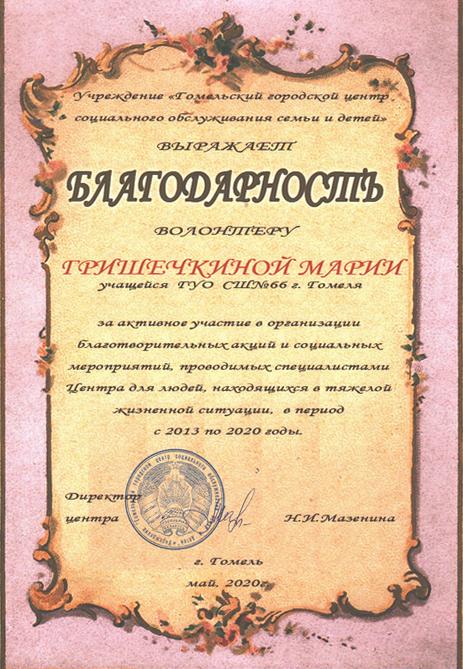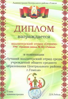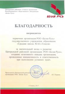 На отчетно-выборной конференции Центральной районной г. Гомеля организации Республиканского общественного объединения "Белая Русь" за 2016/2017 год первичная организация РОО "Белая Русь" нашей школы была награждена Благодарностью за значительный вклад в развитие Центральной районной организации Республиканского общественного объединения "Белая Русь", создание позитивного имиджа организации, проявленные инициативность и ответственность при выполнении уставных задач.С 27 марта по 1 апреля 2017 года прошел второй городской марафон школьного волонтерского движения «В действии!». Отряд волонтеров «Огонек» СШ №66 стал лидером этого конкурса в номинации «Интересная идея». Молодцы, ребята! Так держать!