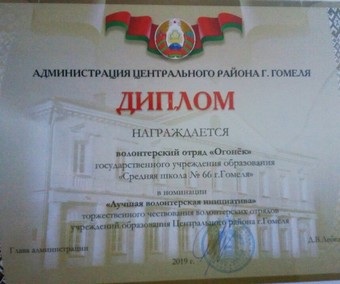 05.01.2023 в Администрации Центрального района г.Гомеля прошло торжественное чествование волонтерских отрядов Центрального района, на котором присутствовали волонтерские отряды учреждений среднего, специального и высшего образования, предприятий и организаций Центрального района. Волонтерский отряд «Огонек» был удостоен диплома победителя в номинации «Мир добрых дел» в районном конкурсе «Лучший волонтерский отряд Центрального района г.Гомеля»