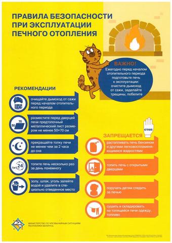 Министерство по чрезвычайным ситуациям напоминает: используя печь для отопления, помните, что ее лучше топить 2-3 раза в день и прекращать топку не менее чем за 2 часа до отхода проживающих ко сну. Нельзя топить печи с открытыми дверцами, применять для розжига горючие жидкости, а также использовать для топки дрова, длина которых превышает размеры топки. Нельзя также сушить и складировать непосредственно на печах и на расстоянии менее 1, 25 м. от топочных отверстий топливо, одежду и др. горючие вещества и материалы. Не оставляйте без присмотра топящиеся печи, и не позволяйте детям самостоятельно их растапливать.