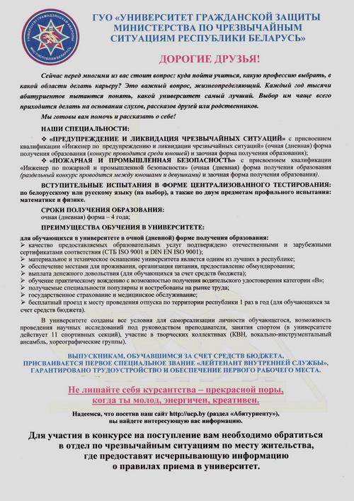 Для участия в конкурсе на поступление вам необходимо обратиться в Гомельский городской отдел по чрезвычайным ситуациям, где предоставят исчерпывающую информацию о правилах приёма в университет!