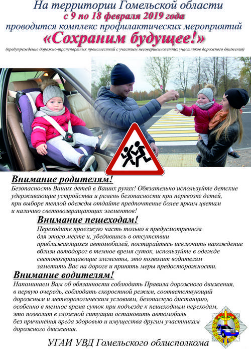С 9 по 18 февраля 2019 года на территории Гомельской области Госавтоинспекцией будет проведен комплекс профилактических мероприятий под названием«Сохраним будущее!», направленный на предупреждение дорожно-транспортных происшествий с участием несовершеннолетних участников дорожного движения.