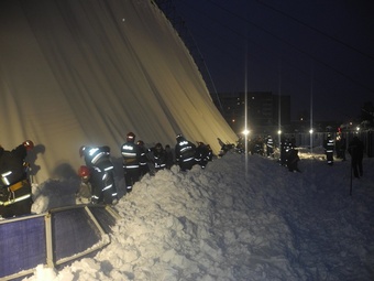 По прибытии к месту вызова было установлено, что произошел обрыв и обрушение части мягкой кровли крытого ледового катка. Травмы различной степени тяжести получили пять человек (в том числе двое детей в возрасте 7 и 11 лет). Все они доставлены в больницы, со слов врачей их жизнь находится вне опасности. Работники МЧС незамедлительно организовали расчистку снега: дополнительно были привлечены курсанты Университета гражданской защиты МЧС, сотрудники ОМОН, РОВД, ГАИ. Работы по расчистке снега завершены. Причина обрушения устанавливается.